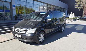 Бизнес-такси Mercedes Viano черного цвета 2013 года выпуска. Кожаный салон: светлый 6 пассажирских мест и тёмный 7 пассажирских мест.